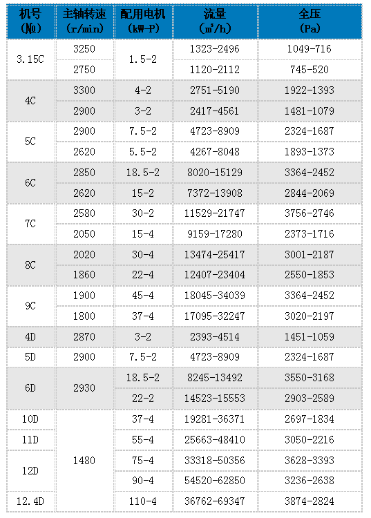 由于工業(yè)鍋爐系列較多,燃用煤質(zhì)優(yōu)劣懸殊,配用的除塵器阻力不一,所需的引風(fēng)機(jī)的風(fēng)量、風(fēng)壓差異較大,Y5-47型鍋爐離心引風(fēng)機(jī)為適應(yīng)上述情況,考慮到風(fēng)機(jī)的經(jīng)濟(jì)性,除配20噸鍋爐的引風(fēng)機(jī)所需功率較大,而用(D式)聯(lián)軸器直聯(lián)傳動(dòng)外,其余均采用三角膠帶(C式)傳動(dòng),不僅能以一個(gè)機(jī)號(hào)采用不同轉(zhuǎn)速來(lái)滿足同一噸位鍋爐配置種類除塵器的要求,減少了風(fēng)機(jī)的系列和機(jī)號(hào),而且也便于作用單位根據(jù)實(shí)際情況,自行變換主軸轉(zhuǎn)速來(lái)獲得所需的較理想的風(fēng)量、風(fēng)壓。 凡進(jìn)氣條件相當(dāng),性能又相適者勻可選用,但最高溫度不得超過(guò)250°C。