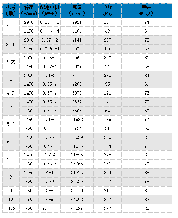 低噪聲T35-11系列軸流風機由葉輪、機殼、集流器及電機等主要部件組成。本系列產品,按葉輪直徑的不同可分成13種型號,依次排列為2.8#,3.15#,3.55#,4#,4.5#,5#,5.6#,6.3#,7.1#,8#,9#,10#,11.2#,等。每種機號葉片又可安裝成15°、20°、25°、30°、35°等五種角度。 本系列產品均采用葉輪直接裝在電動機軸上的直聯結構。在葉輪圓轅速度不超過60m/s條件下配用3種轉速:2900,1450,960r/min。風機面對進風口方向看葉輪為逆時針轉動。