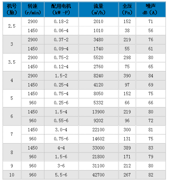 軸流式T40風機按葉輪直徑可分成10種型號,依次排列為2.5#、3#、3.5#、4#、5#、6#、7#、8#、9#、10#等。每種機號葉片又可安裝成15°、20°、25°、30°、35°等五種角度。本系列產(chǎn)品均采用葉輪直接裝在電動機軸上的直聯(lián)結(jié)構(gòu),也可根據(jù)用戶要求做成皮帶傳動KT40系列軸流風機。在葉輪圓周速度不超過60m/s條件下配用3種轉(zhuǎn)速:2900,1450,960r/min。面對進風口方向看葉輪為逆時針轉(zhuǎn)動.